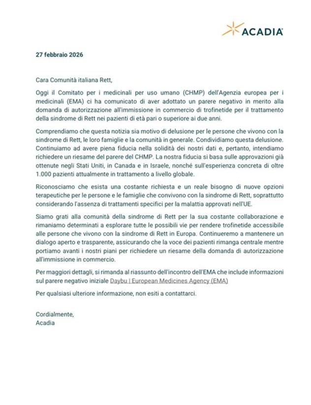 Lo scorso 26 febbraio il Comitato per i medicinali per uso umano (CHMP) dell’Agenzia europea per i medicinali (EMA) ha comunicato all’Azienda ACADIA Pharmaceuticals di aver adottato un parere negativo in merito alla domanda di autorizzazione all’immissione in commercio di Daybu (trofinetide), già commercializzato negli Stati Uniti, in Canada e in Israele per pazienti affetti da sindrome di Rett a partire dai 2 anni in su.